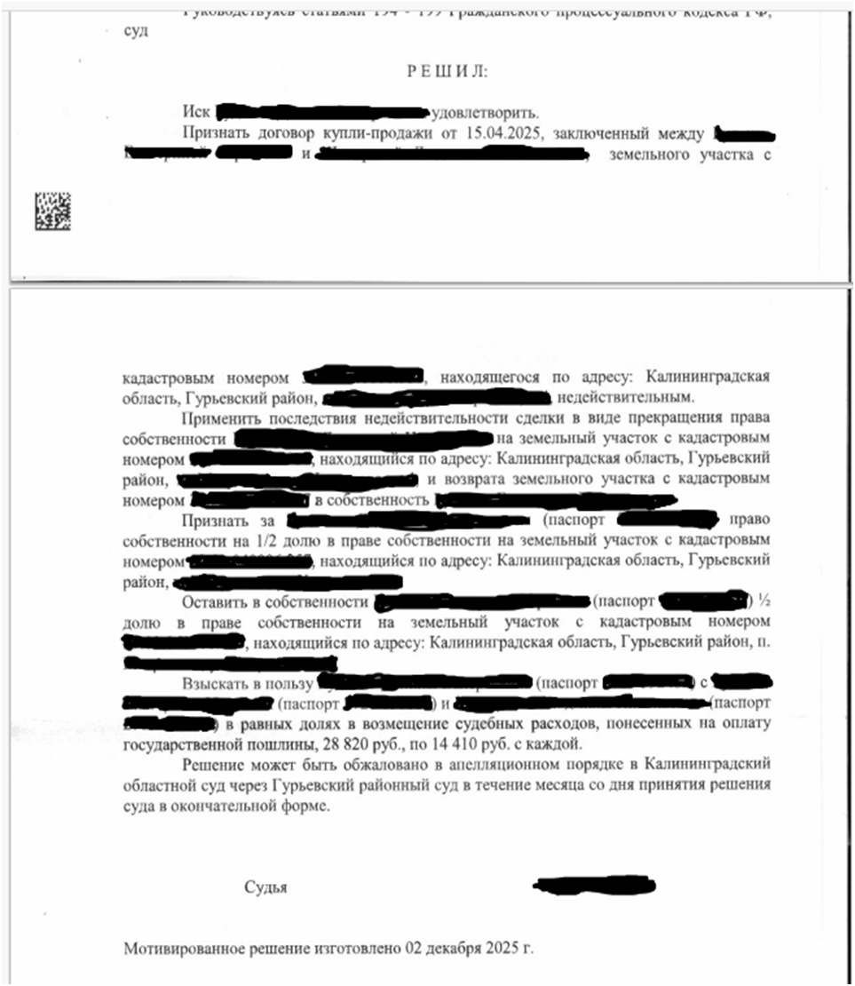 Исходя из установленной совокупности всех обстоятельств совершенной сделки, у нашего доверителя не осталось сомнений, что его бывшая супруга действовала осознанно и расчетливо, желая получить в единоличную собственность приобретенный ими в период брака земельный участок, лишив его права на долю в общем имуществе, и тем самым фактически причинив реальный материальный ущерб.